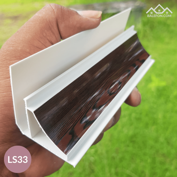 Lis pinggir plafon pvc dengan motif kayu coklat.